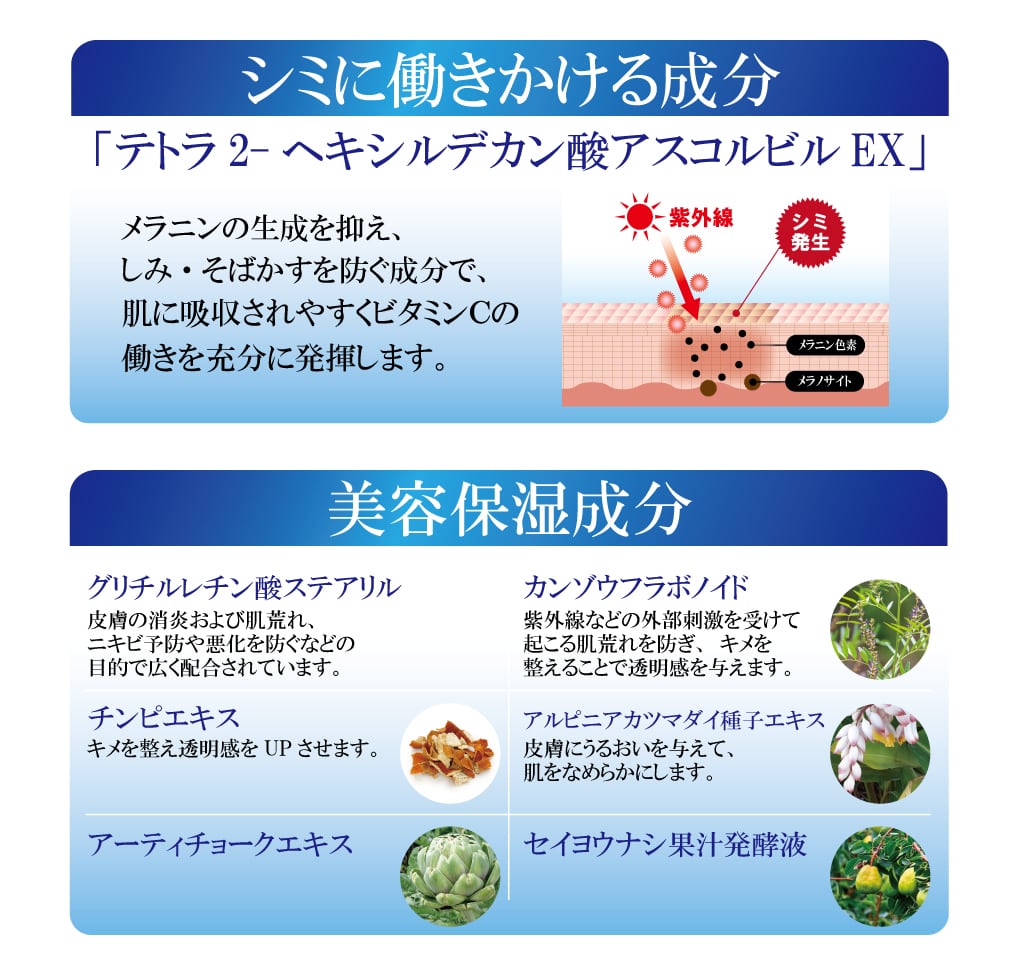 有効成分:テトラ2-ヘキシルデカン酸アスコルビルEX、グリチルレチン酸ステアリル その他の成分:チンピエキス、アルピニアカツマダイ種子エキス、アーティチョークエキス、ワセリン、セイヨウナシ果汁発酵液、プルーン酵素分解物、天然ビタミンE、油溶性甘草エキス、イソノナン酸イソノニル、キャンデリラロウ、メチルシロキサン網状重合体、ジカプリン酸ネオペンチルグリコール、無水ケイ酸、セレシン、カルナウバロウ、グリセリンエチルヘキシルエーテル、酸化Al、ジイソステアリン酸ポリグリセリル、BG